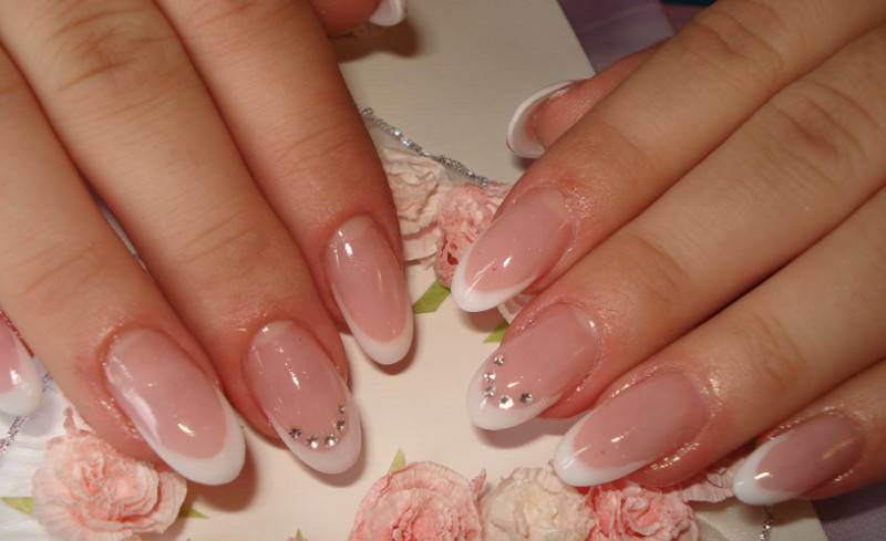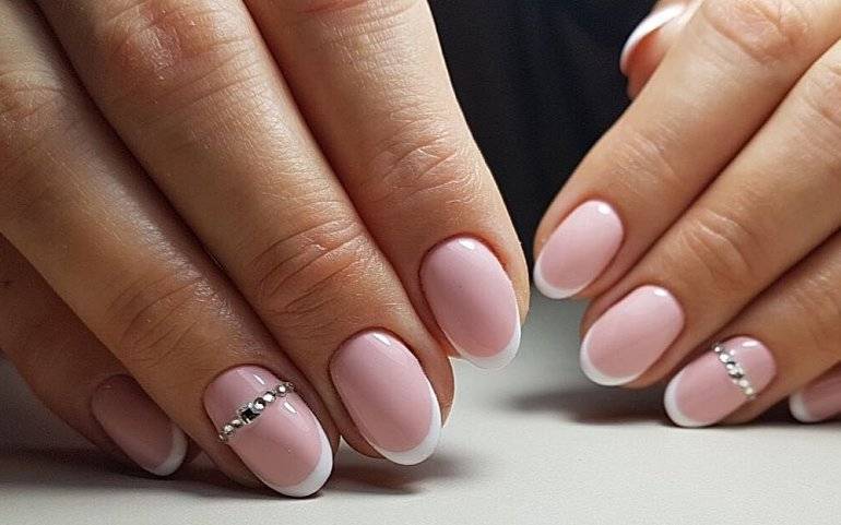 Французский маникюр на круглые ногти. Сегодня френч успешно адаптировался под любую форму и длину ногтей. Но в первоначальном варианте он максимально повторял натуральное строение ногтя. То есть пластинки имели среднюю длину, а белый кончик – округлую форму. Любители классики и по сей день придерживаются этих норм. Хотя цвет линии улыбки можно менять, украшать основу стразами и рисунками.