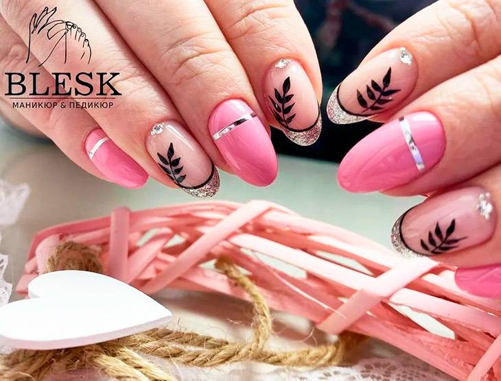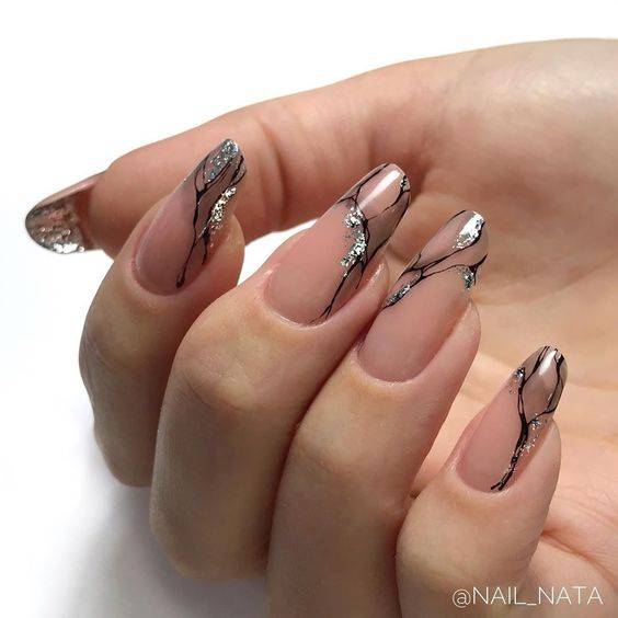 Стоит присмотреться к комбинации нюда и черного с прорисовками абстракции, стемпингу в растительной тематике на темных покрытиях, фольге, присыпке, серебряной паутинке на бирюзе.