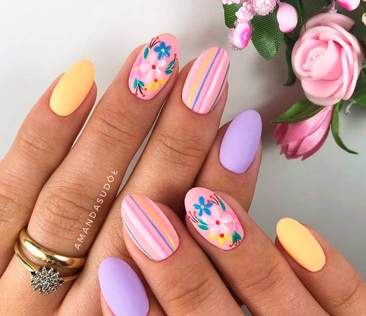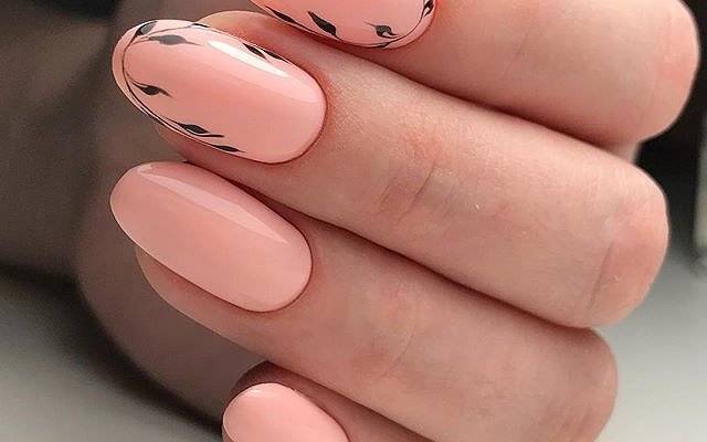 Рисунки в этом сезоне в моде, тем более на овальных ногтях – это веточки, цветы, фантазийная роспись, в том числе, и цветная, нанесение стемпинга (вручную рисуют на штампе, потом переносят на ноготь).