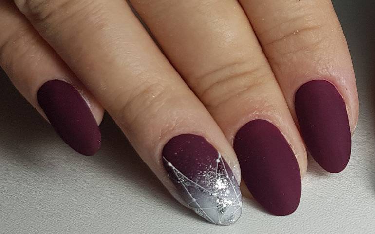 Матовое покрытие гармонирует с широкой ногтевой пластиной и короткими овалами. Лучше всего выбрать пастель, хаки, горчичный, пепельную розу, для акцентов – бордо, фуксию.