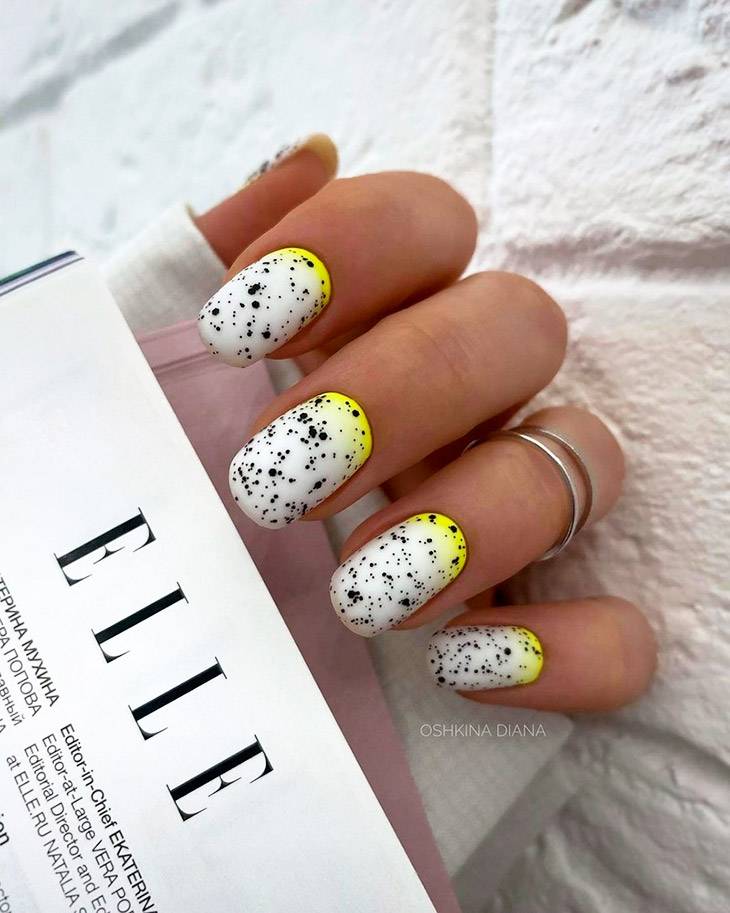 Невероятно эффектно, дорого и роскошно будут смотреться овальные и круглых длинные ноготки, декорированные новомодной техникой «перепелиные яйца» с матовым покрытием сверху. За счет большого пространства для творчества узор получается уникальным и неповторимым, что в свою очередь делает образ любой девушки эксклюзивным и нетривиальным.