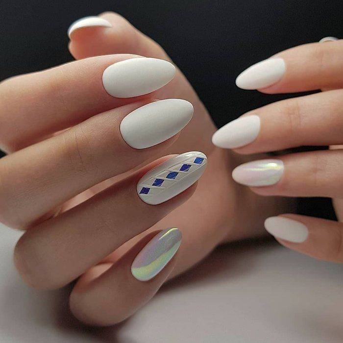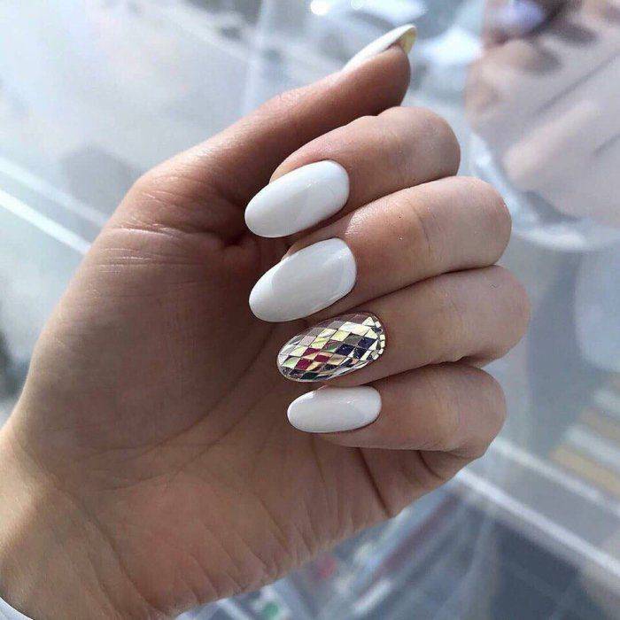 Именно поэтому крайне важно использовать оттенки белого как можно активнее при украшении круглых ногтей в новом году