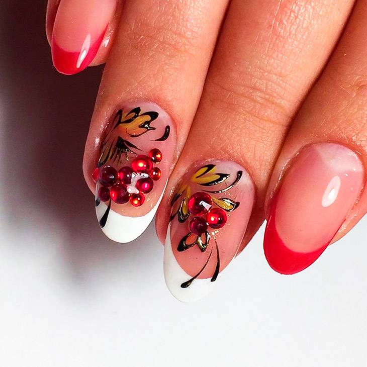 Берут сочные оттенки красного, зеленого, желтого, малинового, голубого, разноцветные росписи одного стиля на одной руке и разным цветом покрытия той же гаммы – на другой.