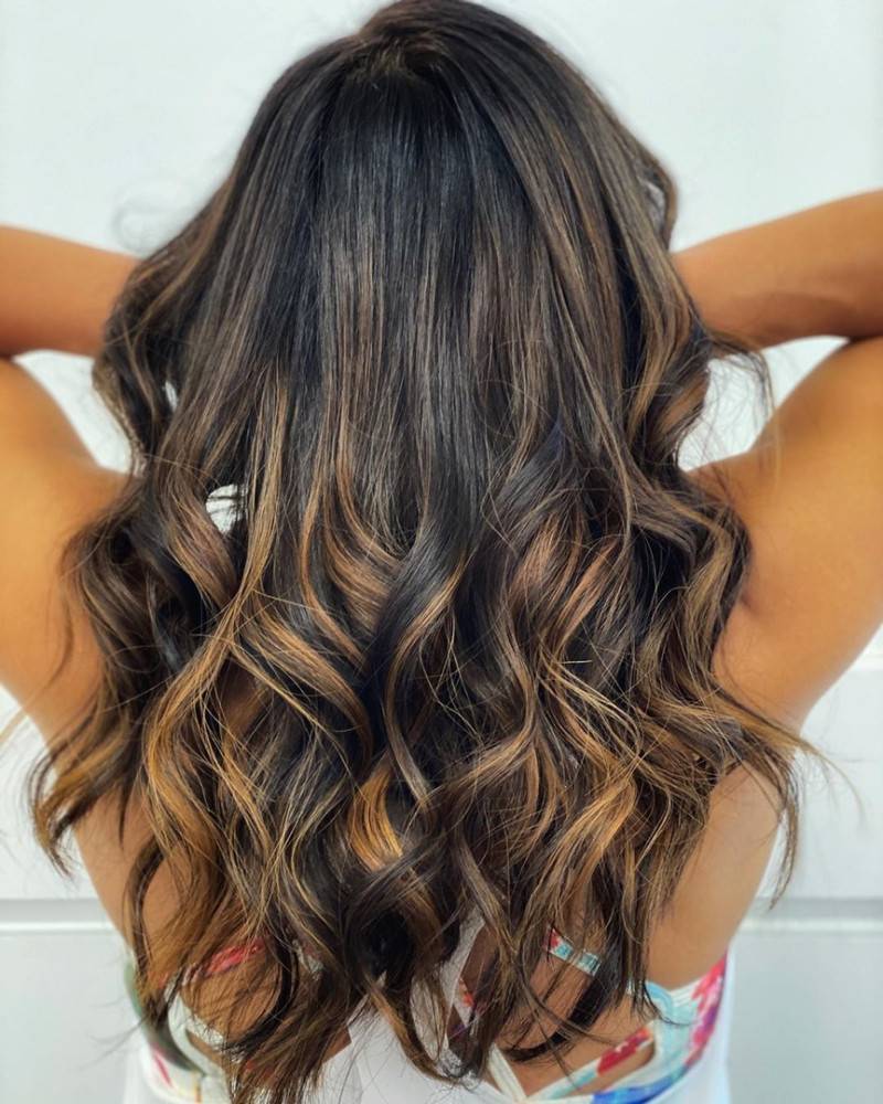- калифорнийское мелирование на тёмные волосы смотрится благородно и изысканно. Главная задача для мастера – добиться естественной, мягкой границы между тёмными корнями и осветлённой частью. Получить такой результат помогает использование трёх – четырёх близких оттенков. Брюнеткам подходят более насыщенные тона: корица, коньяк, кофе;
