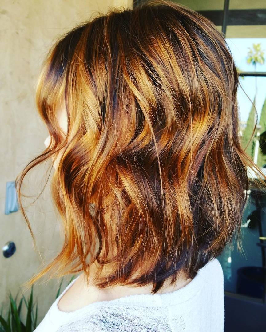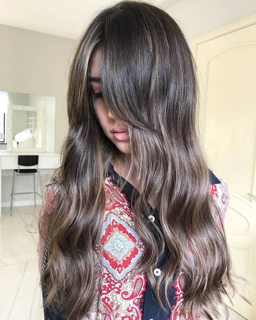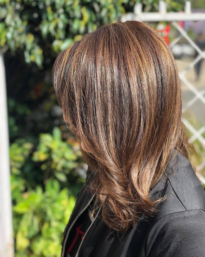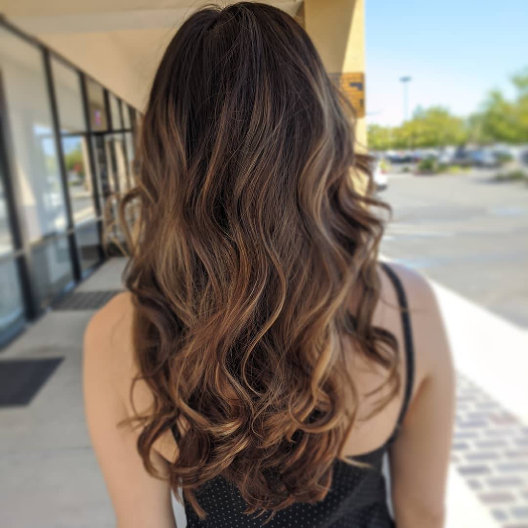 - калифорнийское мелирование на тёмные волосы смотрится благородно и изысканно. Главная задача для мастера – добиться естественной, мягкой границы между тёмными корнями и осветлённой частью. Получить такой результат помогает использование трёх – четырёх близких оттенков. Брюнеткам подходят более насыщенные тона: корица, коньяк, кофе;