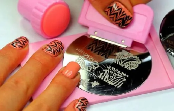 Ногтевая пластина покрывается выбранной цветной основой. Подождите, пока ногти высохнут. Следом выберите узор на шаблоне, покройте узор некоторым количеством лака контрастного оттенка. Прибором под названием скрапер лаковое покрытие тщательно распределяется по гравировке