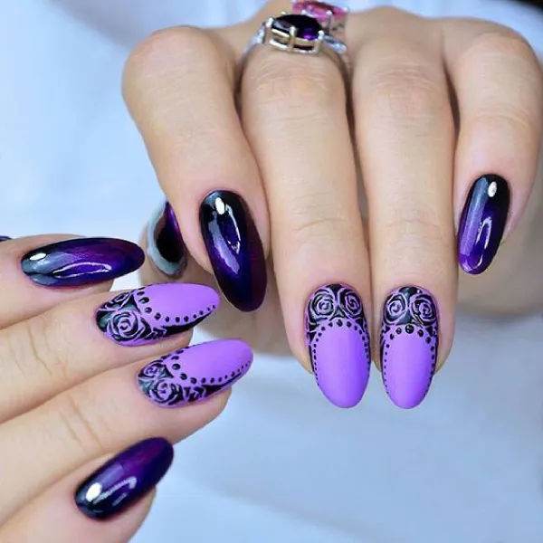Фиолетовый и оранжевый. Такие цвета подходят для осени, зимой они более приглушенные, спокойные. Вы можете сделать интересный нейл-арт, если будете красить ногти в разные оттенки. Затем кружево можно добавить объемное, выбрать сложные узоры с вензелями.