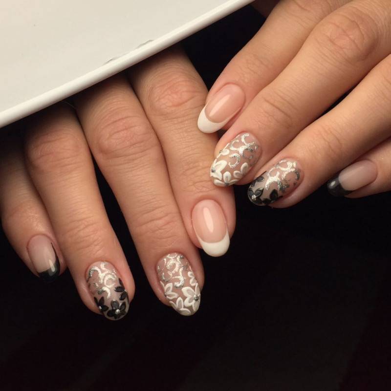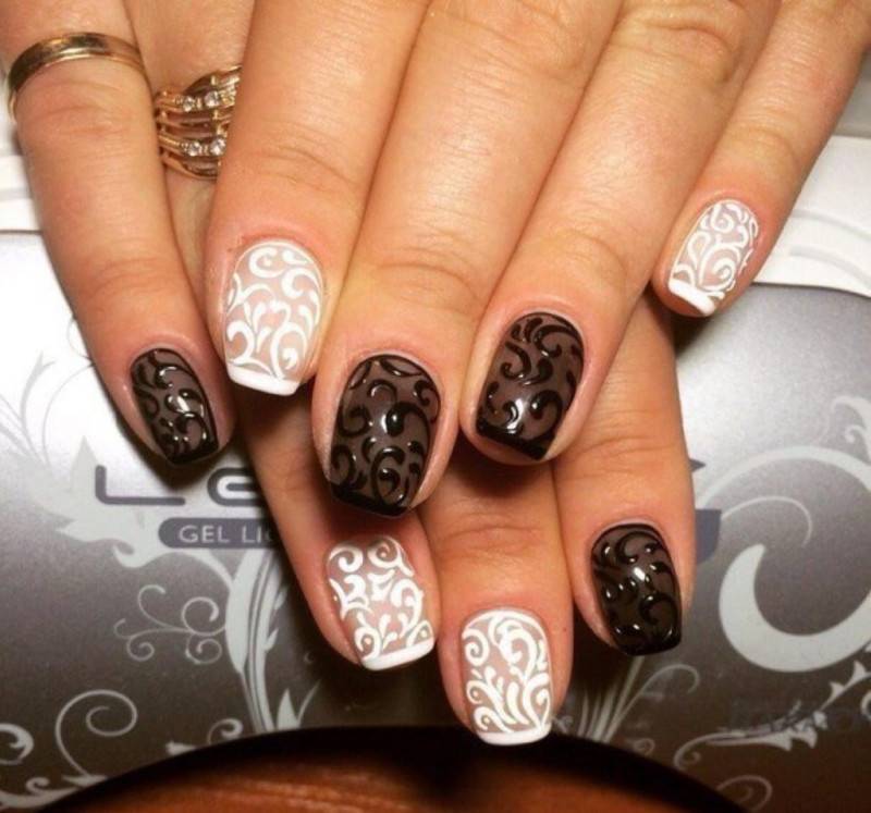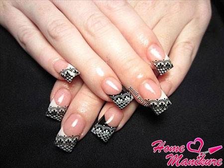 Тем, кто хочет всегда быть в центре внимания, дизайнеры предлагают нанести на ногти аристократические вензеля в черно-белых тонах. Изящно и женственно выглядит френч с кружевом в черно-белых тонах. Он будет уместен, как в офисе, так и на дружеской вечеринке.