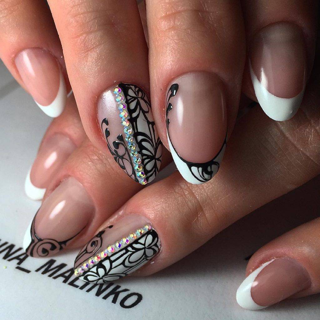 Тем, кто хочет всегда быть в центре внимания, дизайнеры предлагают нанести на ногти аристократические вензеля в черно-белых тонах. Изящно и женственно выглядит френч с кружевом в черно-белых тонах. Он будет уместен, как в офисе, так и на дружеской вечеринке.