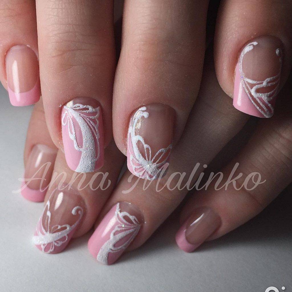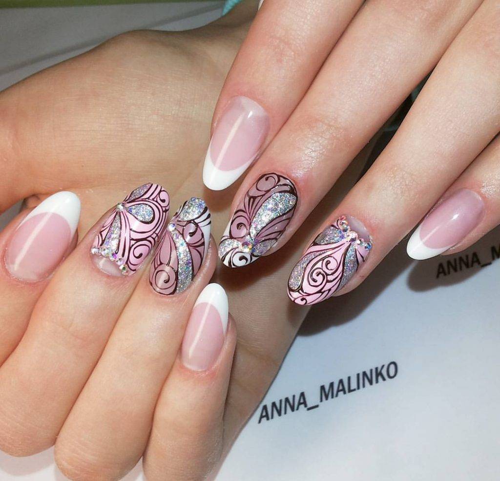 Самое распространенное исполнение данного маникюра – основа белого или розового цвета, с наличием легкого ненавязчивого рисунка. Это действительно классика. Орнамент может быть расположен в центре ногтевой пластины, по ее краю или у основания.