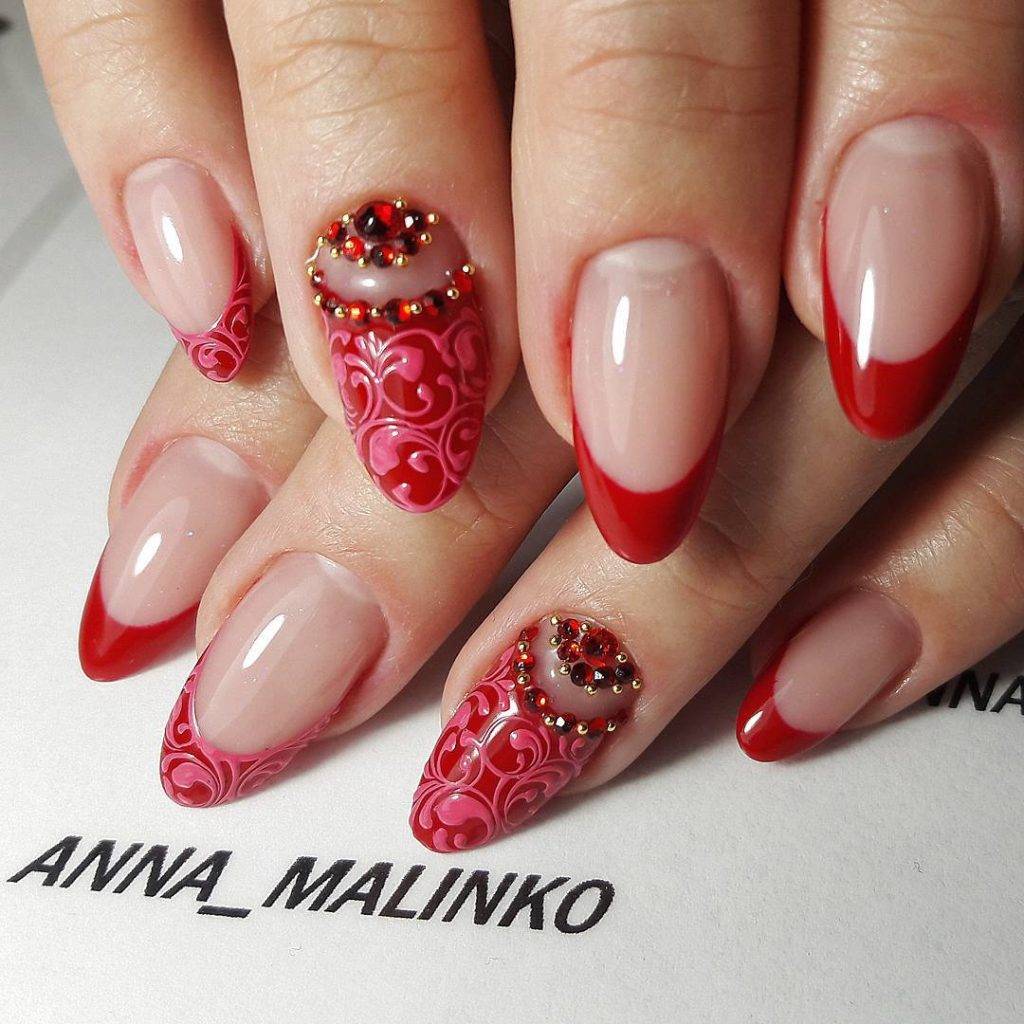 Любительницам ярких насыщенных оттенков точно понравится выразительный френч с кружевом, украшенный цветными бусинками, стразами, блестками или другими элементами декора.