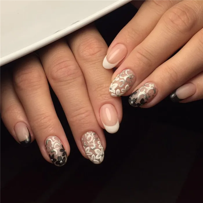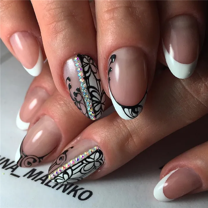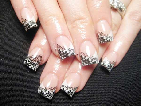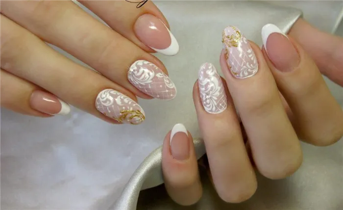 - Французский с кружевом. Поскольку французские ногти не ограничиваются определенным цветом, девушки могут экспериментировать. Главное — не переусердствовать и не сочетать френч и кружево на одном ногте,