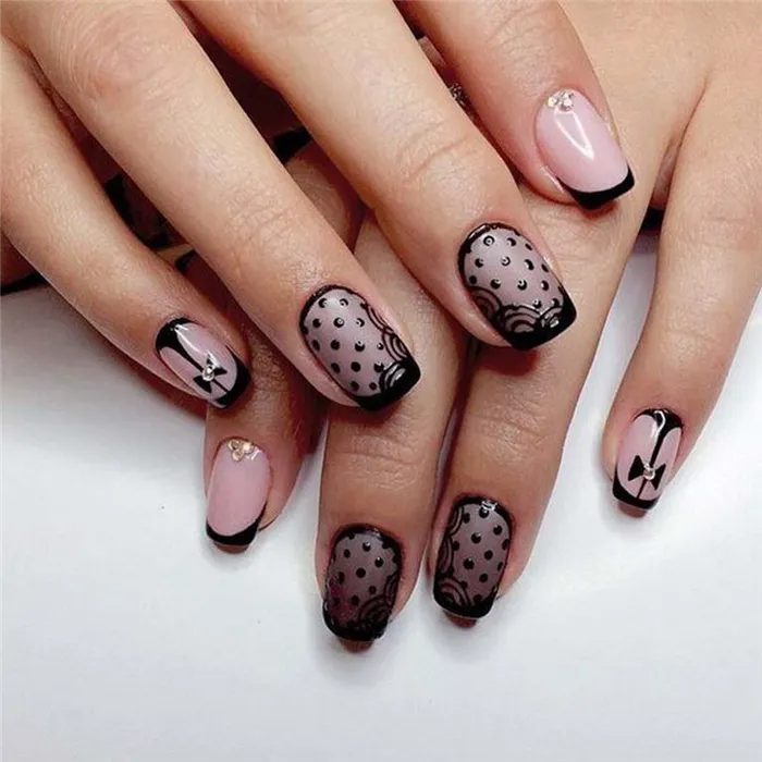 Ажурный френч хорош и в черном варианте. Черное кружево добавляет маникюру роскоши, особенно в сочетании с золотыми вкраплениями, и может стать прекрасным выбором для вечернего выхода.