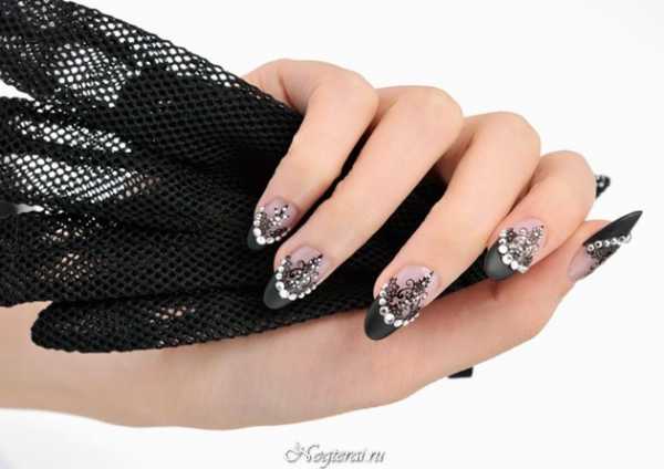 Ажурный рисунок придает ногтям такой же впечатляющий эффект, как и использование настоящего кружева. Например, так сразу и не поймешь: или это роспись под ажурное тонкое черное кружево, или же использовано и правда настоящее кружево.