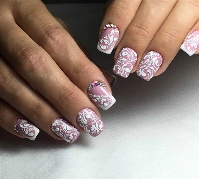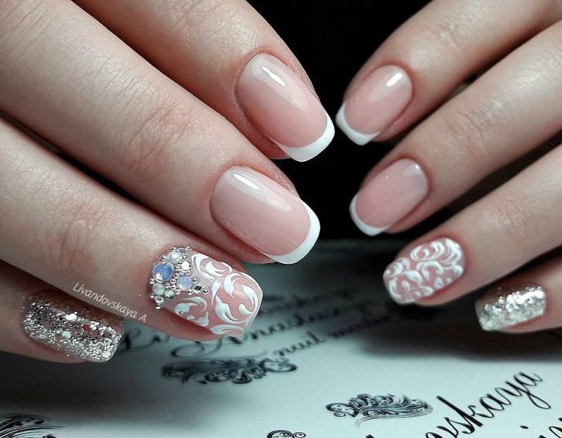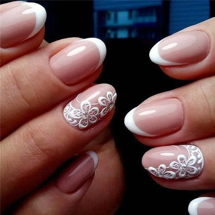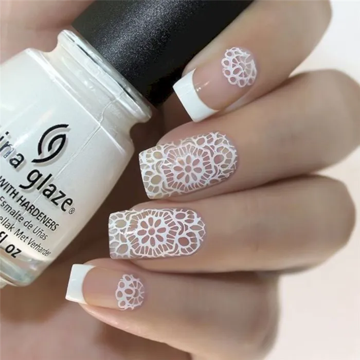 Для торжественного случая белый ажурный френч можно дополнить миниатюрной акриловой лепкой или стразами, соблюдая, конечно же, чувство меры.