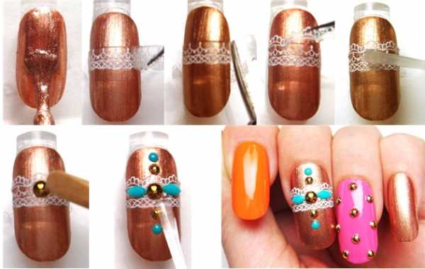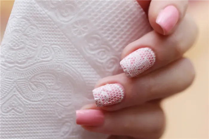 Один ноготь покрывают прозрачным лаком или основой, и пока слой не высох, при помощи пинцета размещают кружево подходящего размера и формы. Затем процедура поочередно выполняется на оставшихся ногтях. В результате получается такой же дизайн, как и на фото. Чтобы его закрепить, необходимо использовать закрепитель или прозрачный лак.
