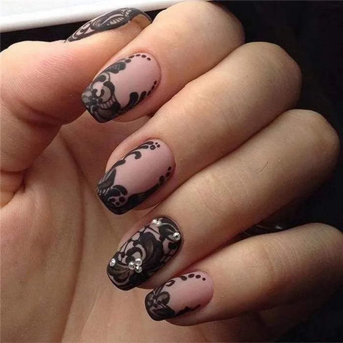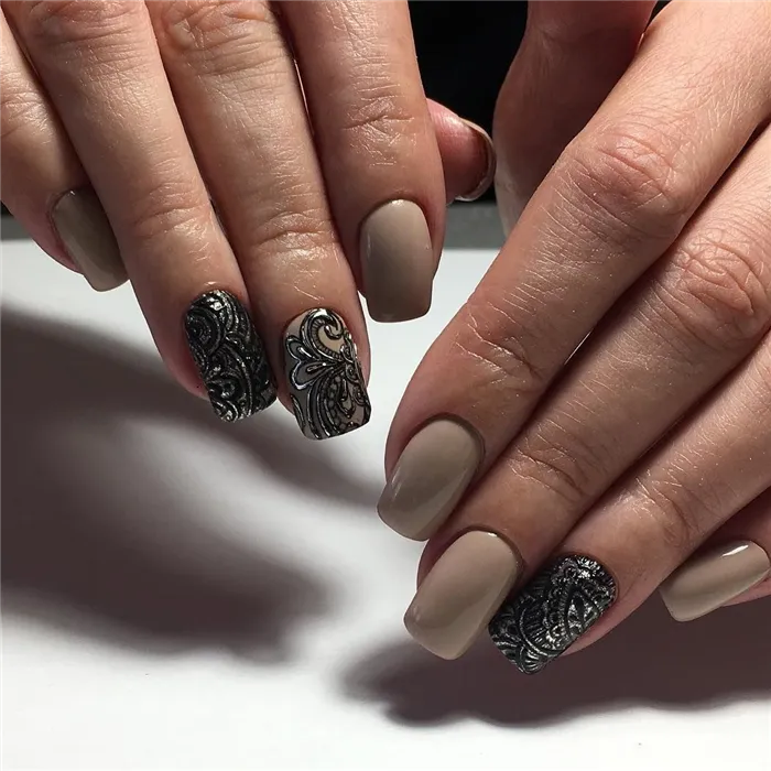 Отлично выглядят чёрные ажурные элементы на матовом ноготке бежевого цвета. Современные девушки по достоинству оценят такой дизайн, который подчёркивает отменный вкус обладательницы маникюра. Это стильное решение идеально как для работы, так и для праздника.