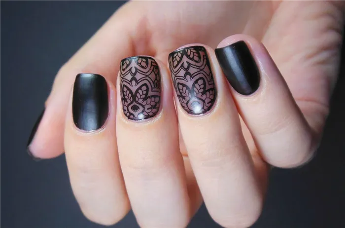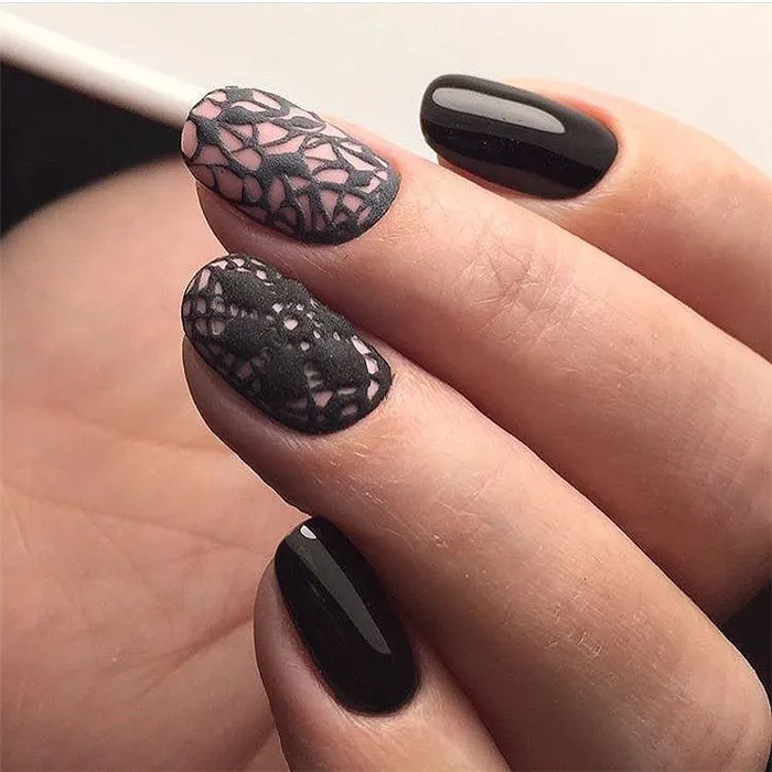 Чтобы выполнить такой дизайн, нужно нанести матовый лак на ноготки, а сверху сделать красивый кружевной узор глянцевым лаком. Если под рукой нет матового лака, попробуйте нанести на ногти специальное покрытие. Для матового маникюра с кружевом подойдут контрастные оттенки. Лучше выполнять работу тёмными цветами.