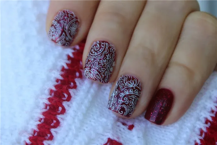 Что касается покрытия в красном цвете, то его чаще всего выбирают для посещения мероприятий. Столь яркий френч можно дополнить дизайном в виде абстракции, кружева, геометрии или цветочного рисунка. Каждый из них по-своему хорошо украшает классику. Дополнительный декор в данном случае все также уместен. Поскольку многое зависит от размера блесток и их количества. Цвет таких деталей лучше выбирать исходя из наряда, который вы планируете надеть на торжество. Наибольшей популярностью пользуются золотистые и серебристые блестки. Считается, что они всегда будут уместными.