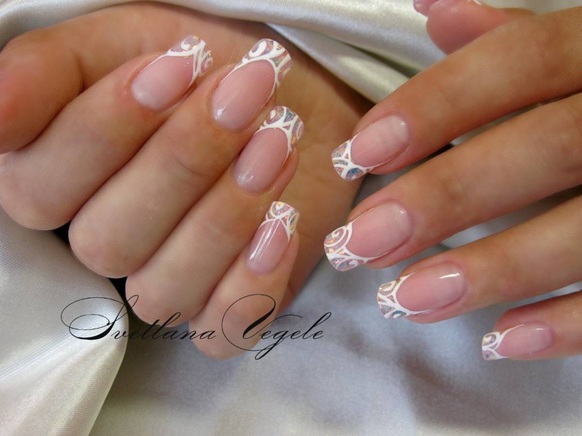 Для торжественного случая белый ажурный френч можно дополнить миниатюрной акриловой лепкой или стразами, соблюдая, конечно же, чувство меры.