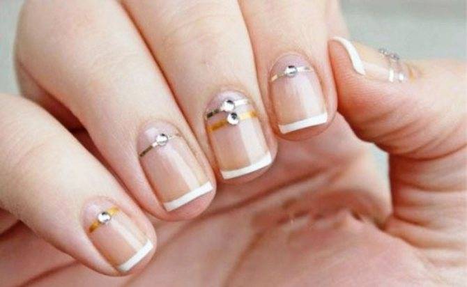 - французский маникюр — неширокая белая полоска по краю ногтя;