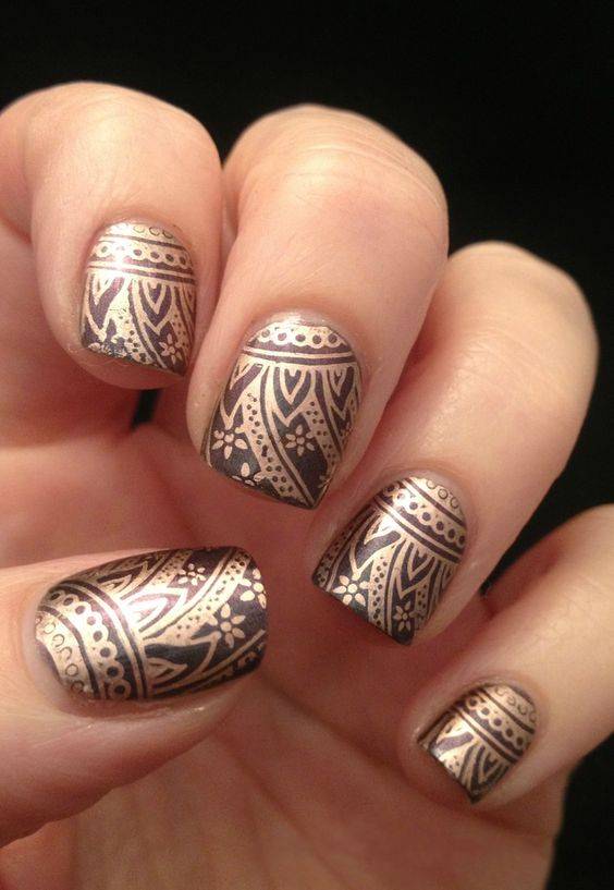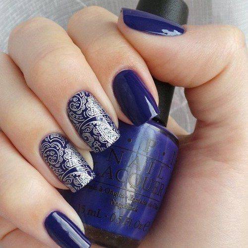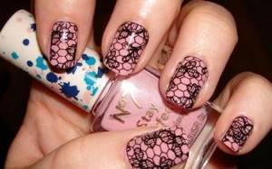 2. Наклейки, имитирующие кружево, стемпинг. Этот способ используется в маникюрных салонах довольно давно и облегчает работу мастера по созданию различных рисунков. Нарисовать орнамент можно точно таким же способом. Его суть заключается в том, что лак наносится на трафарет, с помощью которого рисунок переносится на резиновую кисть, а затем на пластину ногтя. Базу перед нанесением рисунка окрашивают в основной цвет, а поверхность закрепляют.