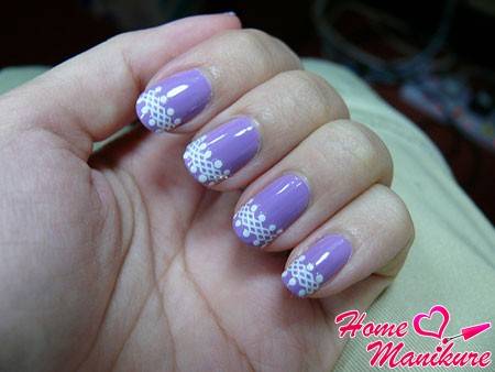 Рассмотрим дизайн ногтей «Кружево» своими руками на примере узора «вуалетка». На свободную часть края ногтевой пластины наносят мелкую сеточку из обычных полосок, но на каждом пересечении линий ставят точечку. Такой рисунок отлично смотрится в любом цвете. Однако если вы решили загромоздить всю поверхность ногтя, то лучше остановить выбор на классическом белом оттенке.
