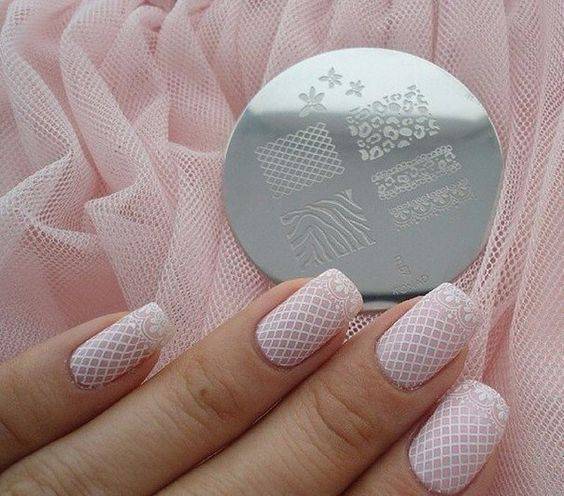 Более простым способом создания красивого рисунка является стемпинг для ногтей. Чтобы изобразить кружева, вам понадобится специальный диск, штамп и декоративный лак. Главным преимуществом этой техники является то, что рисовать вручную ничего не потребуется. Цветной лак просто наносится на стемпинг-диск с нужным принтом, а затем кружевной рисунок с помощью штампа переносится на ноготь. Мы подготовили для вас замечательный мастер-класс, в котором продемонстрирована техника выполнения такого маникюра.