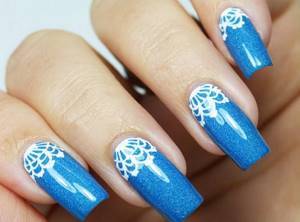 Есть специальное кружево для маникюра. Оно очень тонкое, нежное, украшено цветами. С такими средствами маникюр будет еще изящнее! Для фиксации кружева используется клей. Защитное покрытие наносить не обязательно, так как кружево уже пропитано специальным средством, не пропускающим воду. Это обеспечивает долговечность маникюра.