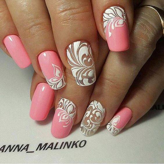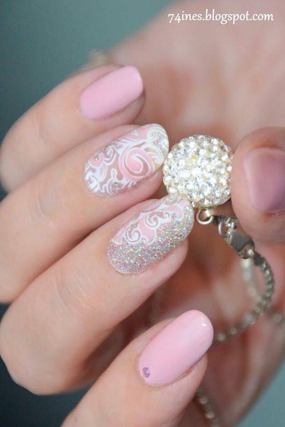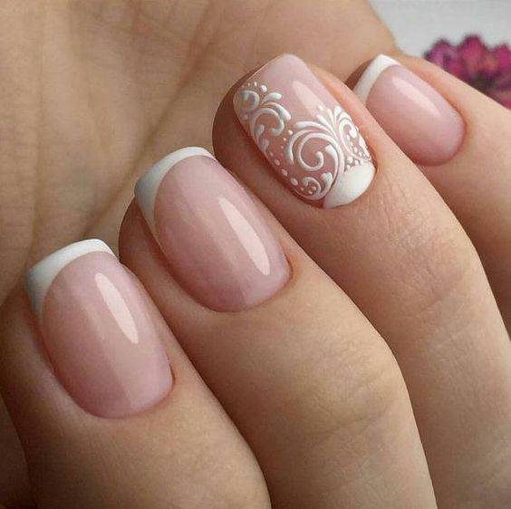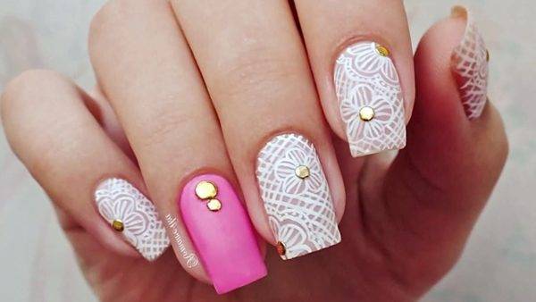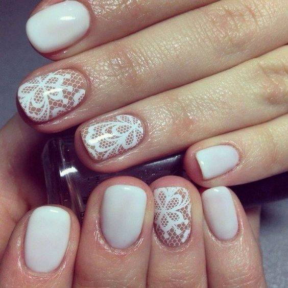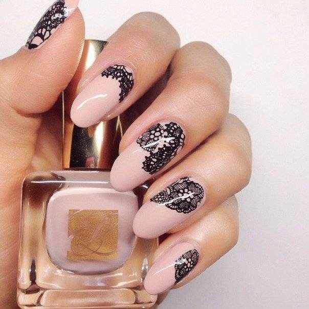 Выбрав под основу лак розового или бежевого цвета и соединив его с белым или золотым кружевом, вы не прогадаете в маникюре.