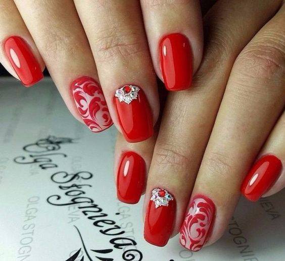 Красивый праздничный маникюр 2021-2022 невозможно представить без декоративных элементов. Белый жемчуг на алом или вишневом покрытии придает образу оттенок аристократизма. Популярный дизайн ногтей со стразами стильно представлен в красно-белом исполнении. На акцентные ноготки наносят стразы красного или белого цвета в зависимости от фона.