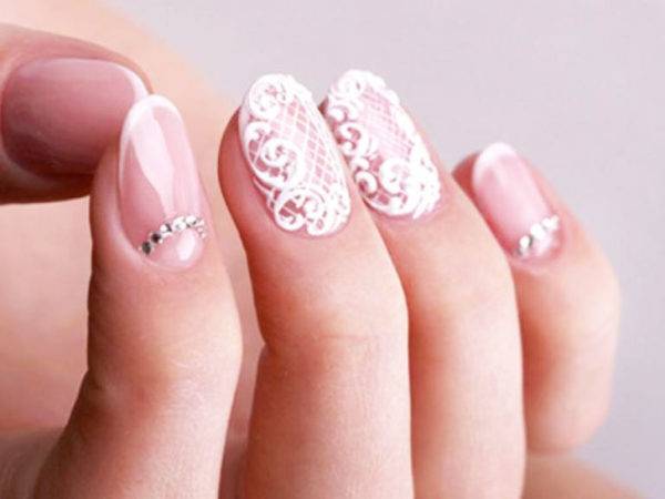 Свадебный кружевной маникюр с декором из страз и жемчужинок