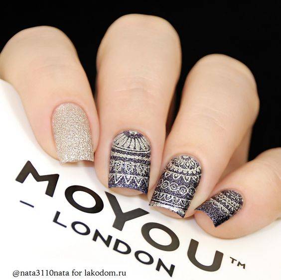 Матовые и глянцевые металлические дизайны – это самая модная тенденция нейл-арта в последнее время. Можно встретить наклейки для сплошного покрытия, а также выбитые металлизированные узоры для комбинации с основным цветом ногтей.