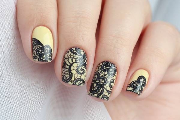 Если вы решили прибегнуть к первому способу нанесения, то нужно быть очень аккуратной при создании такого дизайна. Конечно, спокойно можно обойтись без художественных навыков, но вот материалы надо подбирать тщательно. Кружево должно быть качественным, с красивым мелким узором, интересными завитками. Тогда и на ноготках оно будет смотреться интересно и уникально.