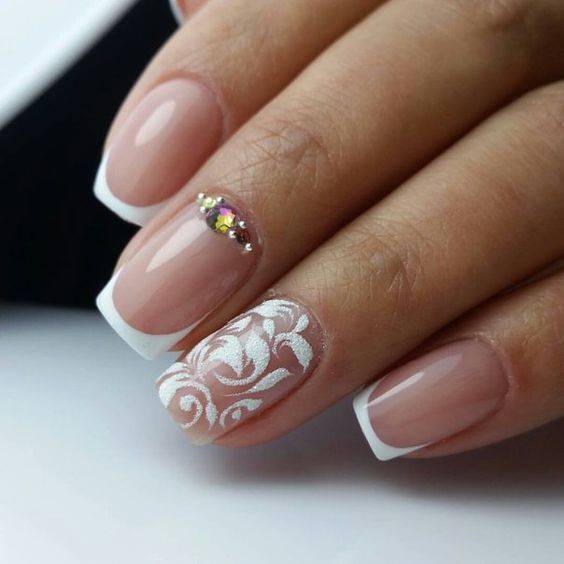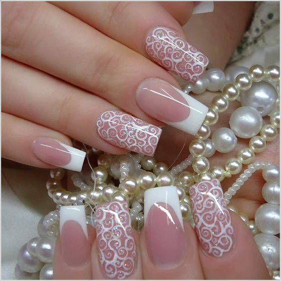 Очень часто свадебный кружевной маникюр дополняют аксессуарами: стразами, блестками, бархатным песком, жемчугом, камнями.