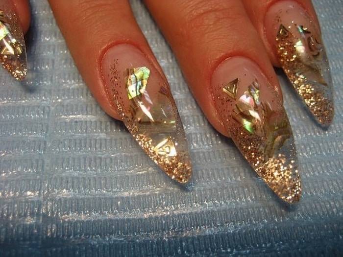 После того, как был нанесен скульптурный гель, высушен и был сформирован ноготок, можно приступать к декорированию, которое ничем не отличается по процессу от пошаговых действий на натуральных ногтях. Единственное, чем отличается такой дизайн — возможность размещения объемных элементов для композиции (акриловой лепки, бусин, ракушек, цепей и пр.).