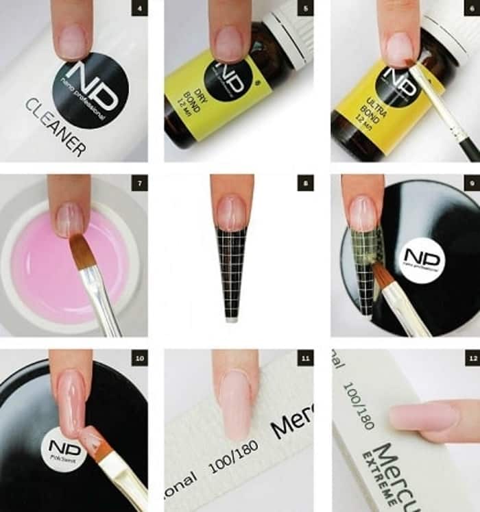 Искусственно нарощенные ногти дают больше возможности для фантазии и позволяют сделать более сложный, оригинальный нейл-арт. По сути техника аквадизайна на наращенных ноготка практически не отличается от той, которая применяется для натуральных ногтей. Вся сложность лишь в самой процедуре и технологии наращивания, которое поэтапно выглядит так.