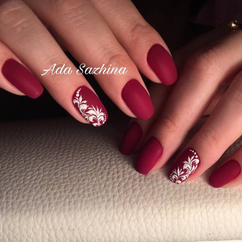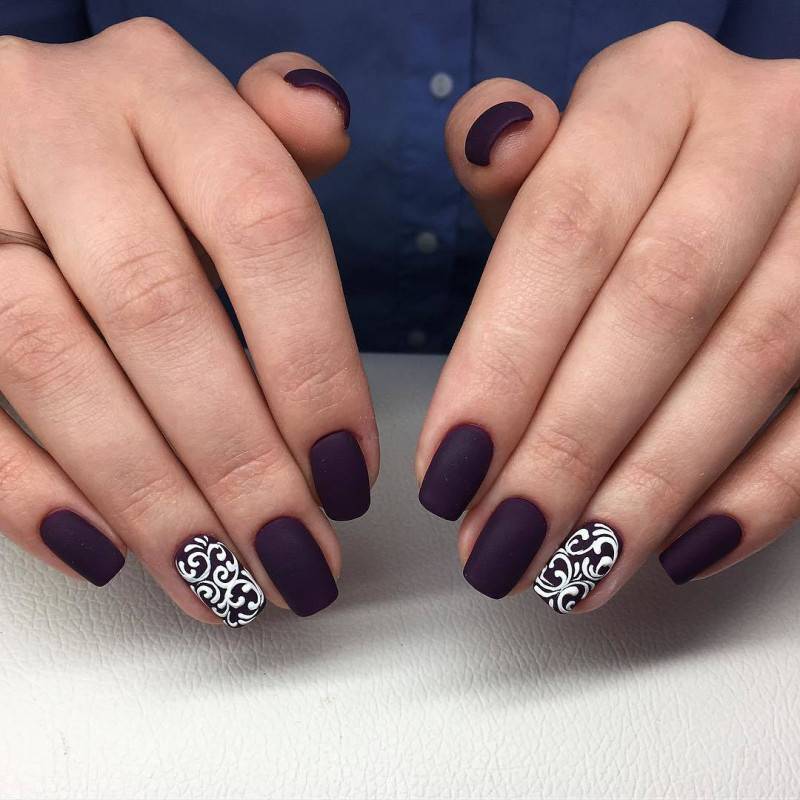 Матовый маникюр. Такой нейл-арт может выполняться в нескольких вариациях. В первом, наиболее распространенном, ноготь покрывается матовым лаком, а сверху стемпингом, наклейкой или кисточкой рисуются кружева. Сам рисунок может быть блестящим, тогда будет интересная игра цвета и фактур, или же матовым – такой тотал-лук не оставит равнодушным никого. Второй вариант маникюра – на блестящую основу узор наносится матовым лаком. Из-за того, что матовый рисунок на обычном лаке сильно выделяется, это может стать интересной деталью образа.