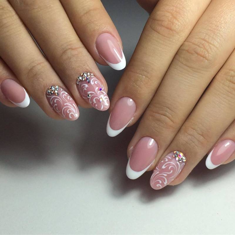 Чаще всего для формирования целостного женственного образа узоры делают белым цветом на розовой или прозрачной основе. Это невероятно романтично!