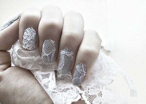 Украсить ногти настоящими кружевами. Вы можете выбрать любые кружева, сеточку или даже тюль. Его потребуется совсем немного — ровно столько, чтобы покрыть поверхность ногтей.