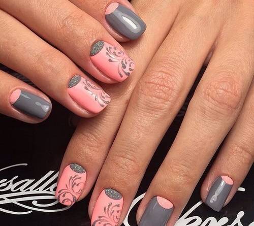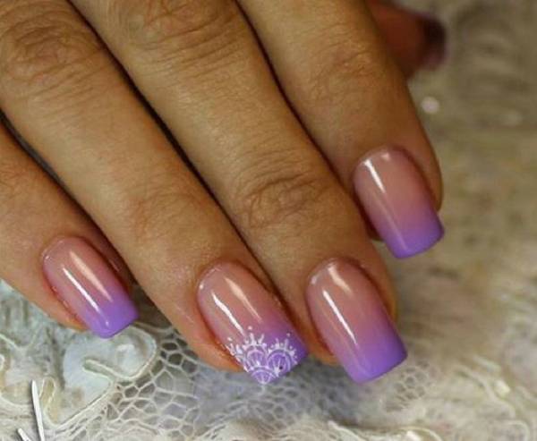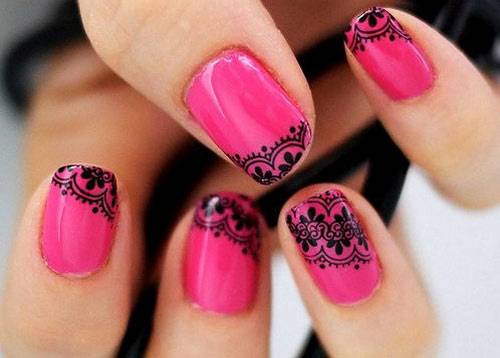Очень нежное сочетание. Только учтите тот аспект, что на розовом фоне белое кружево будет не очень заметно. Прежде всего это огромный плюс, так как такой дизайн можно будет сделать даже в офис. Но если хочется выделить рисунок, то оформляйте его в контрастных тонах. Это может быть черный, фиолетовый или сиреневый.