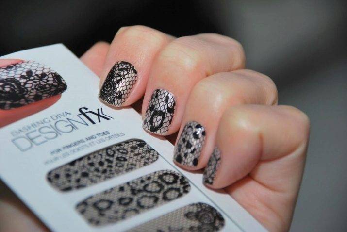 Технология нанесения на ногти такой же, как и в первом способе. Но некоторые наборы выпускаются в виде наклеек, что существенно облегчает процесс нанесения кружева на ногти.