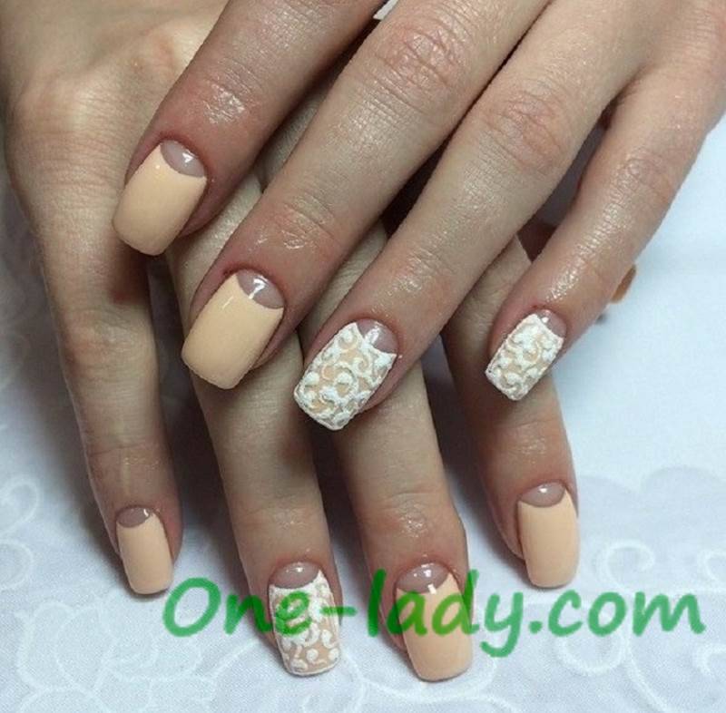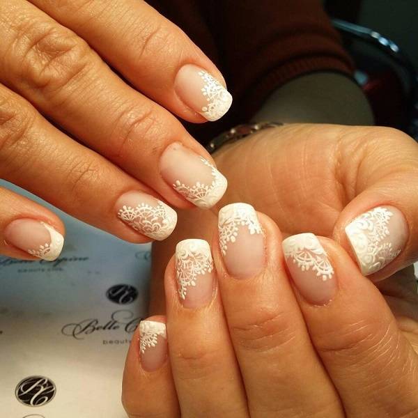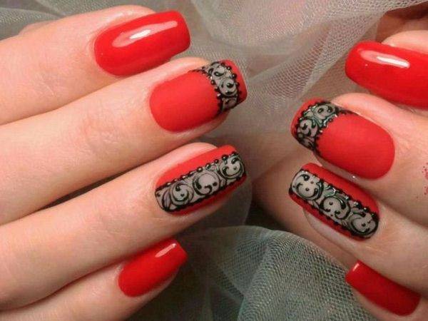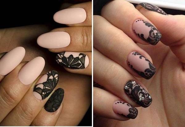 Матовый маникюр. Такой нейл-арт может выполняться в нескольких вариациях. В первом, наиболее распространенном, ноготь покрывается матовым лаком, а сверху стемпингом, наклейкой или кисточкой рисуются кружева. Сам рисунок может быть блестящим, тогда будет интересная игра цвета и фактур, или же матовым – такой тотал-лук не оставит равнодушным никого. Второй вариант маникюра – на блестящую основу узор наносится матовым лаком. Из-за того, что матовый рисунок на обычном лаке сильно выделяется, это может стать интересной деталью образа.