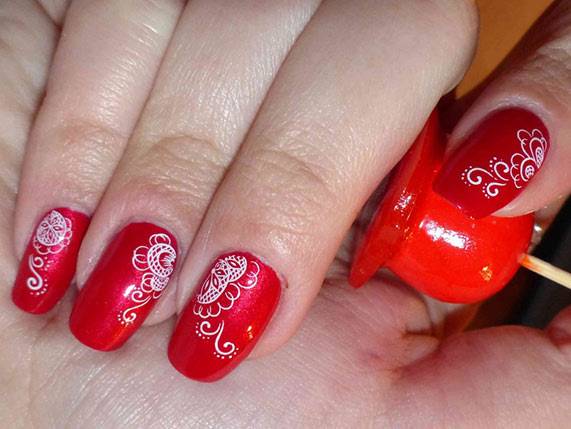 - Выбираем правильный оттенок красного лака и аккуратно окрашиваем им свои ноготки. Тщательно просушиваем.