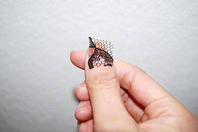 Вырежьте кусочки кружева соответственно размеру ногтевых пластинок.