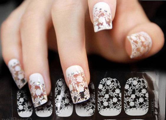 Кружевной маникюр можно сделать и без рисования. Существует 3 способа, которые идеальны для тех, кто не любит долго и с упорством корпеть над маникюром. Также в этих способах можно обойтись без специальных гель-лаков или акриловых красок. Первый из них предусматривает использование специальных наклеек, имитирующих кружево. Они наклеиваются на ногти, а затем сверху наносится прозрачныйлак для закрепления результата.