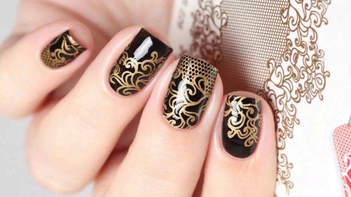 Большой ассортимент различных золотых и серебряных узоров в виде наклеек для нейл-арта можно найти в специализированных магазинах. При этом значительно упрощается процесс самого маникюра. Даже новичок сможет приклеить тоненькую пленочку на ноготь так, что это будет выглядеть аккуратно и естественно.