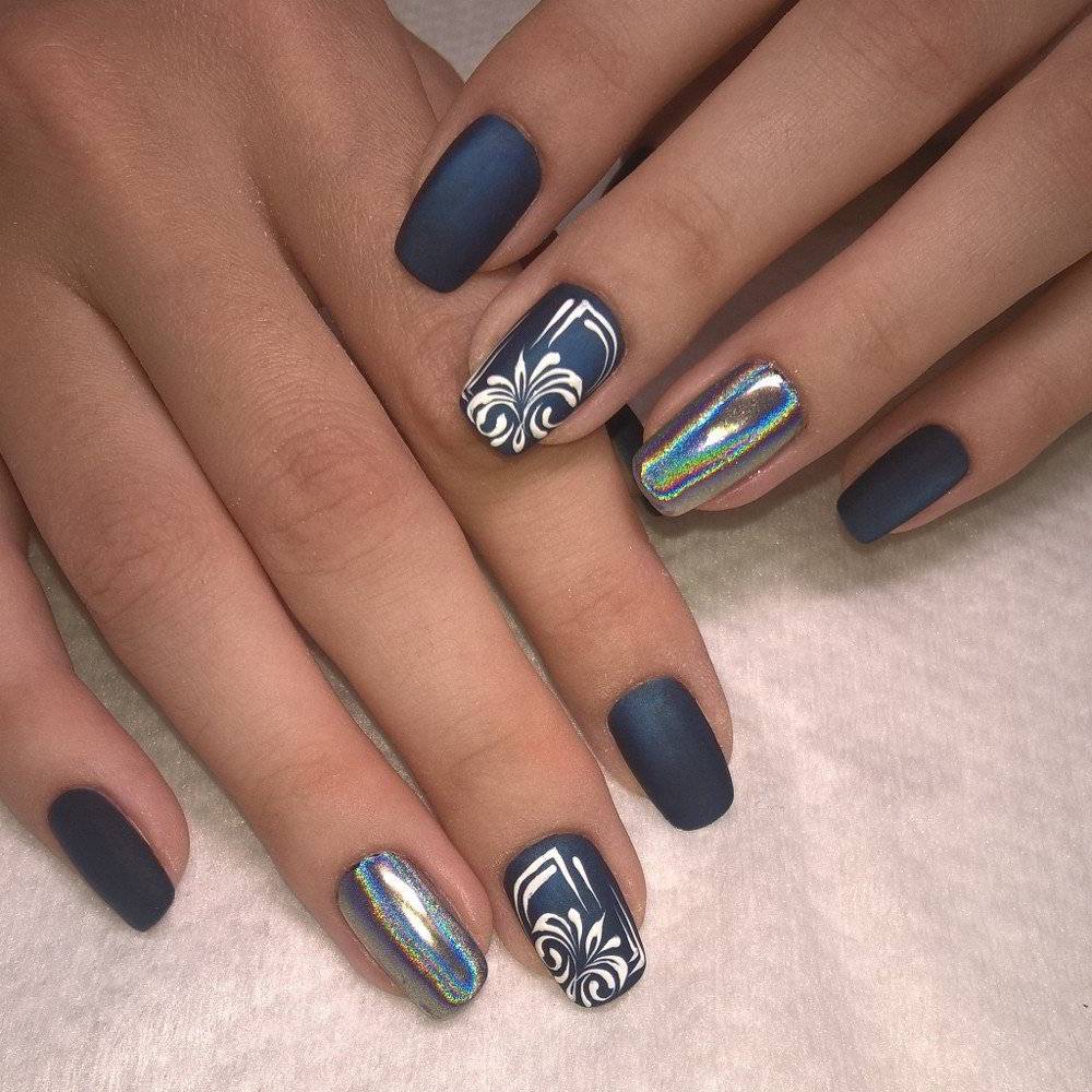 Тех, кто хочет шикарный маникюр с узором, заинтересуют узоры на ногтях, сочетающие матовый и глянцевый рисунок в одном нейл-арте.