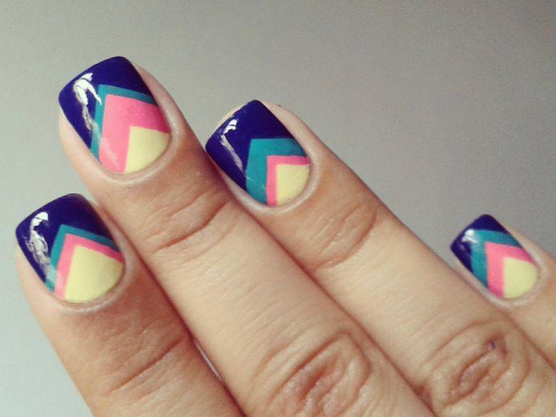 - Зигзаги. Этот рисунок можно тоже сделать в домашних условиях обычной иглой. Для этого необходимо провести цветным лаком две параллельные линии, используя зубочистку или толстую иголку. Затем тонкой иголкой аккуратно соединить их, создавая тем самым колоритные зигзаги. Этот дизайн очень интересно смотрится с применением нескольких декоративных средств и использования блеска.