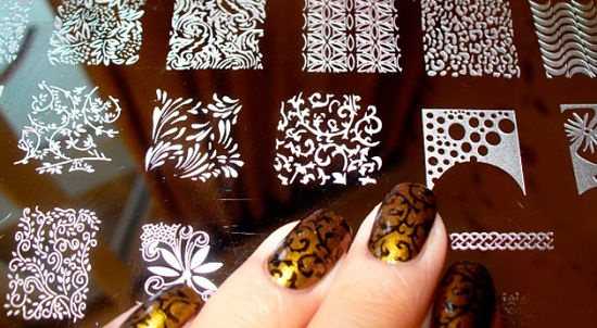 - при стемпинге используется трафарет, по которому рисуем гель лаком. Для начинающих эта техника достаточно удобна, поскольку не требует особых навыков. Однако к дизайну не получится ничего добавить;